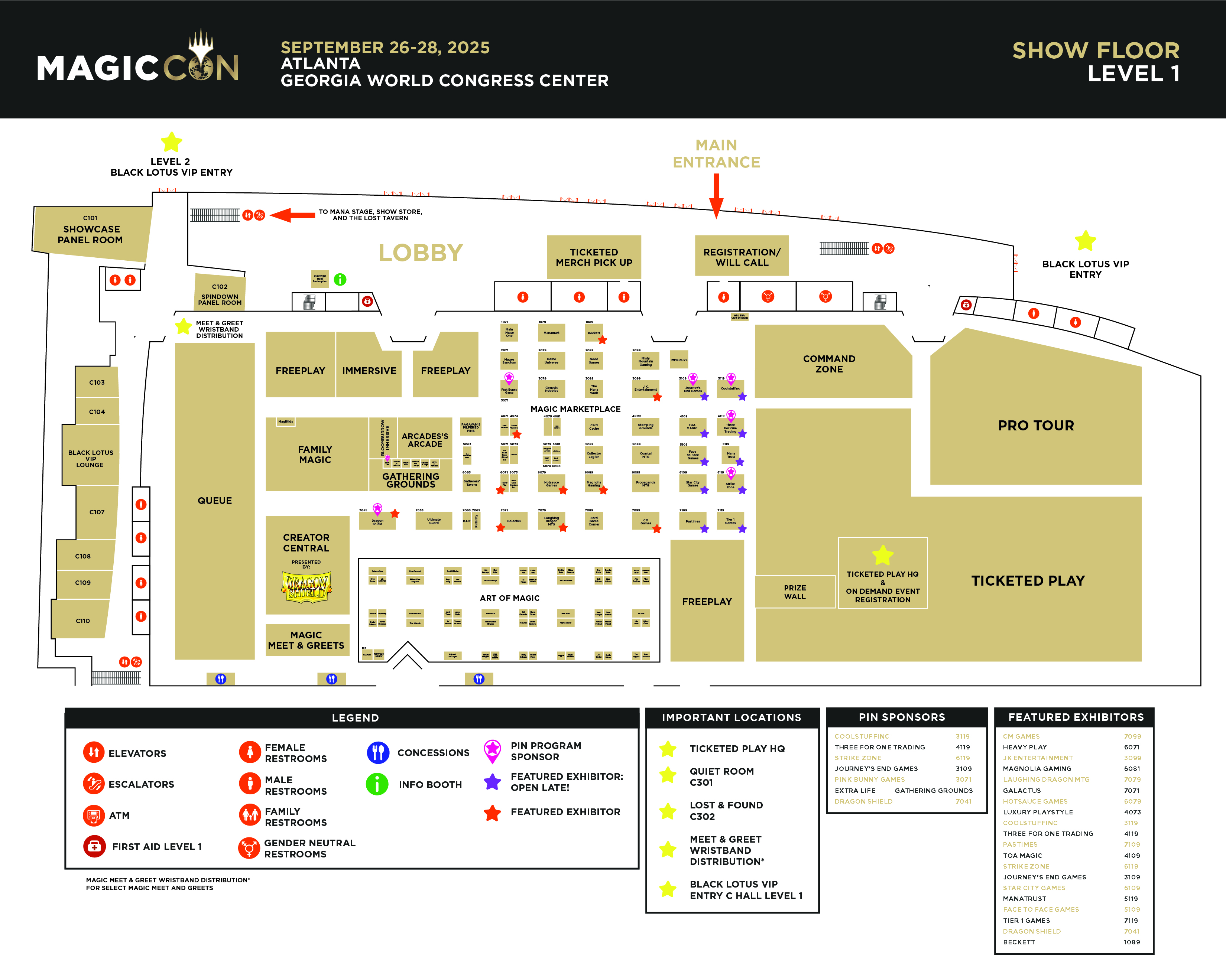 The Magic Marketplace, Art of Magic, Meet & Greets, Ticketed Play, Pro Tour Qualifier, and Black Lotus VIP Lounge are all located on Level 1 of Building C. The official Show Store is located in the Thomas Murphy Ballroom, Level 5 of Building B. Queueing inside for all areas will begin at 8:00 AM.